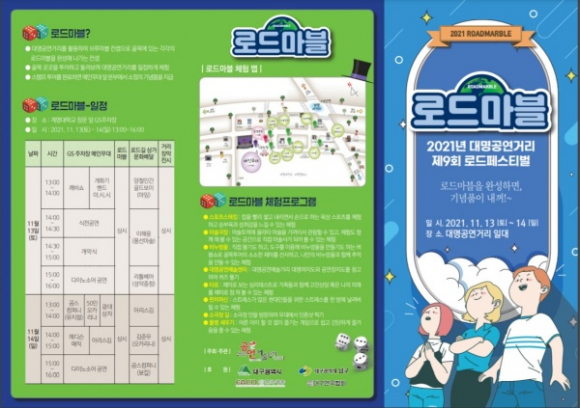 ‘로드마블’은 간단한 놀이 미션을 수행하며 대명공연거리 골목 구석구석을 돌아 볼 수 있는 체험프로그램으로 전체 체험을 모두 마치면 공연예술단체에서 준비한 소정의 기념품을 받을 수 있다.