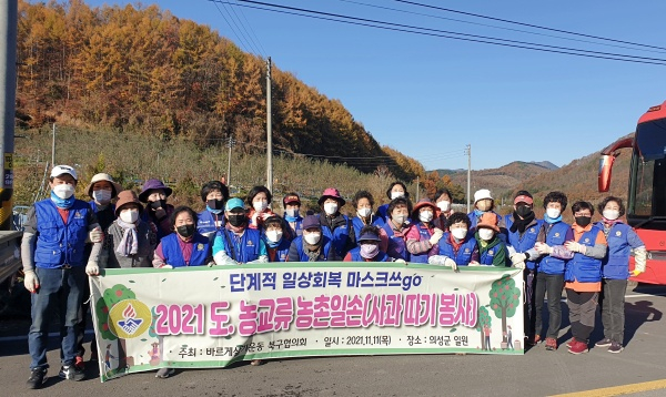 바르게살기운동북구협의회(회장 최영훈)는 11월 11일(목) 코로나19로 일손이 부족한 의성군 춘산면 다문화 가정에 사과수확작업을 돕는 행사를 실시하였다.