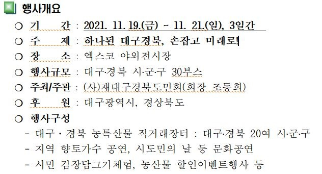 11월 19일(금)부터 3일간 엑스코 야외광장에서 ‘2021 대구경북 농산물 상생장터 화합한마당’ 행사가 열린다.