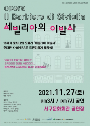 서구문화회관은 11월 27일(토) 오후 3시와 7시, 2회에 걸쳐 서구문화회관 공연장에서 트렌디 오페라 ‘세빌리아의 이발사’를 개최한다.
