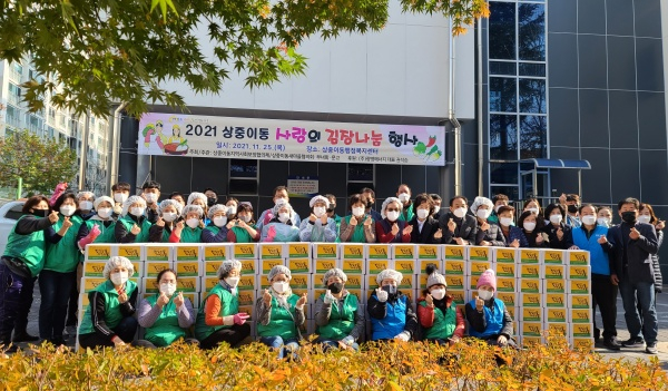 대구 서구 상중이동 행정복지센터(동장 김정희)는 지난 25일 동 행정복지센터 주차장에서 상중이동 새마을협의회·부녀회·문고, 지역사회보장협의체, (사)사랑의 연탄나눔운동본부 등 50여 명이 참여해 ‘2021 사랑의 김장 나눔행사’를 개최하여 김장김치(5kg) 350상자를 홀몸어르신, 취약계층 등에 전달했다.