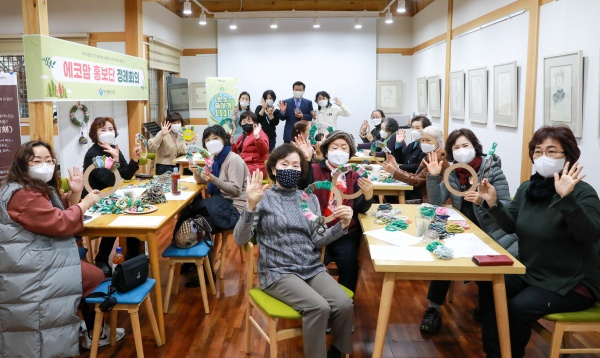 양말목공예는 양말을 만들 때 생기는 의류 폐기물인 양말목을 재활용해 생활소품을 만드는 업사이클링 공예로, 이날 회원들은 컵뚜껑 화분과 크리스마스 리스 만들기를 통해 친환경 활동을 펼쳤다.
