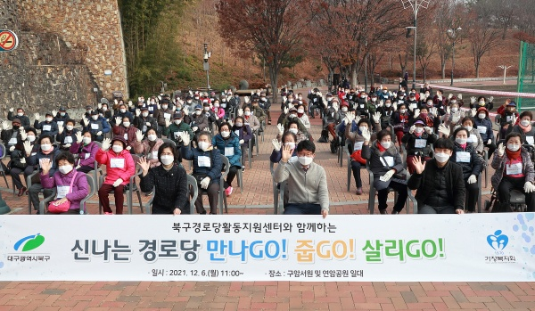 가정종합사회복지관 부설 북구경로당활동지원센터(소장 박보리)에서는 북구경로당활동지원센터와 함께하는 신나는 경로당 ‘만나GO!, 줍GO!, 살리GO!’플로깅 사업을 12월 6일(월) 산격동 지역 경로당 회원 90여 명이 참여한 가운데 연암공원 일대에서 진행했다.