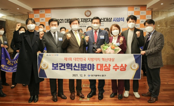 대구 중구(구청장 류규하)는 12월 9일 서울 건설회관에서 개최된 ‘2021 대한민국 지방자치 혁신대상’시상식에서 전국 지자체 중 유일하게 ‘보건혁신분야 대상’을 수상했다.