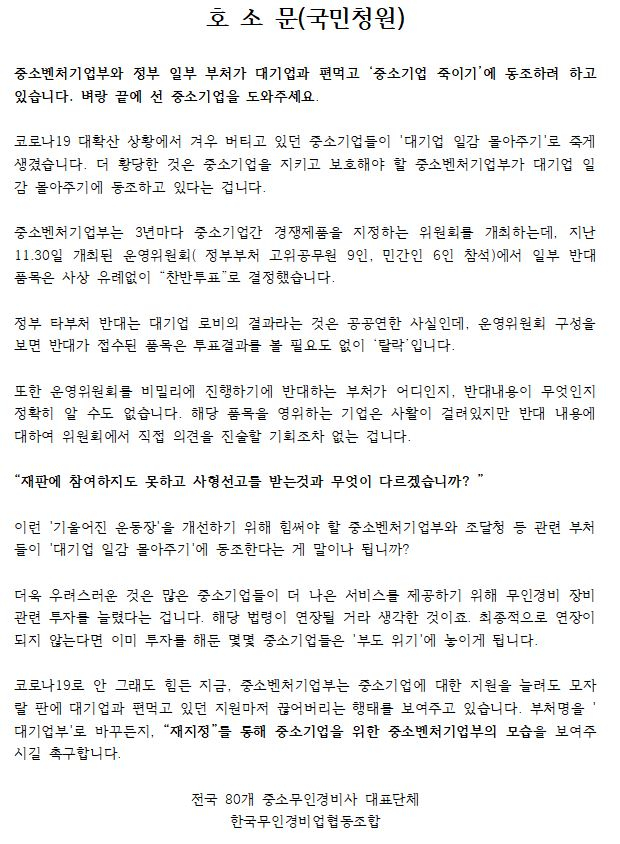 한국무인경비업협동조합(이사장 김학수, 이하 조합) 지난 12월 6일 중소벤처기업부장관 명의로 고시된 “중소기업자간 경쟁제품(이하 ”경쟁제품“)” 지정내역과 관련하여 “시설물경비서비스” 품목에서 “무인경비업”이 제외된 것과 관련하여 지난 12월 7일 45개 법인대표와 함께 중소벤처기업부를 항의방문하고 재지정 해줄 것을 호소하는 호소문을 발표했다.