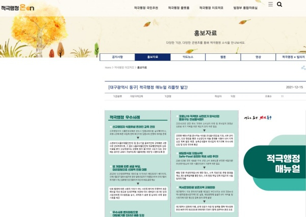 | ↑↑ 대구 동구청 적극행정 매뉴얼 리플릿이 게시된 인사혁신처 적극행정 ON 홈페이지 화면 |
