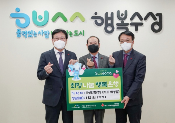 대구 수성구(구청장 김대권)는 지난 17일 구청 2층 소회의실에서 우성환경(주)(대표 최병일)으로부터 1억 원 기부 약정을 받고 성금 전달식을 진행했다.