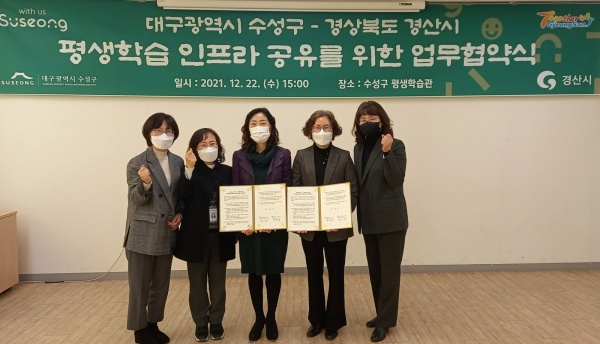 이번 업무협약은 수성구-경산시 협력사업의 일환으로, 두 도시의 평생학습시설과 프로그램을 공유하며 상생 발전하기 위해 마련됐다.