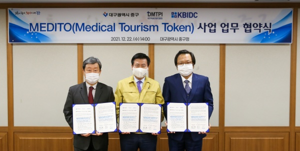 대구 중구(구청장 류규하)는 지난 22일 대구의료관광진흥원, ㈜KBIDC와 메디토(MEDITO, 메디컬투어리즘 토큰) 사업 지원 업무협약을 체결했다.