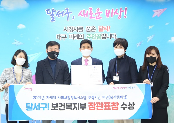 대구 달서구(구청장 이태훈)는 22일 2021년 차세대 사회보장정보시스템 구축기반 마련 유공 ‘복지멤버십 운영 분야’에서 기관 보건복지부 장관 표창을 수상했다고 밝혔다.
