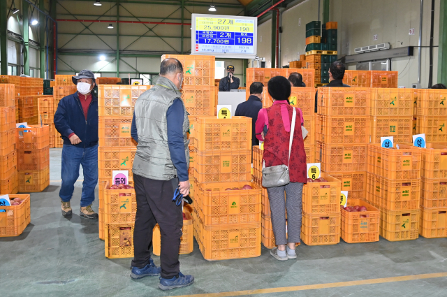 이날 첫 경매는 2021년에 수확하여 저장중인 청송사과 만생종 후지(富士)에 대한 경매로 진행되었으며, 물량 3,994상자/18kg를 경매하여 상자 당 평균가격 45,850원을 기록했다.