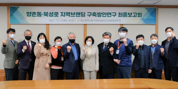 대구 중구의회 의원연구단체 ‘청라언덕(회장 권경숙)’은 지난 21일, 중구청 상황실에서 최종보고회를 개최하여 「향촌동‧북성로 지역브랜딩 구축」 방안을 제시했다고 31일 밝혔다.