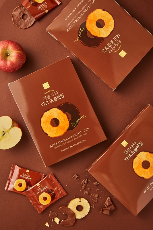 ”청송사과초콜릿칩(3종)“은 청송사과 원물을 특수 열풍건조 방식으로 건조하여 한쪽 단면에 고급 초콜릿(다크, 화이트, 요구르트)을 입혀 청송사과의 새콤달콤한 맛과 식감을 살려 만든 고급 디저트 간식이며,