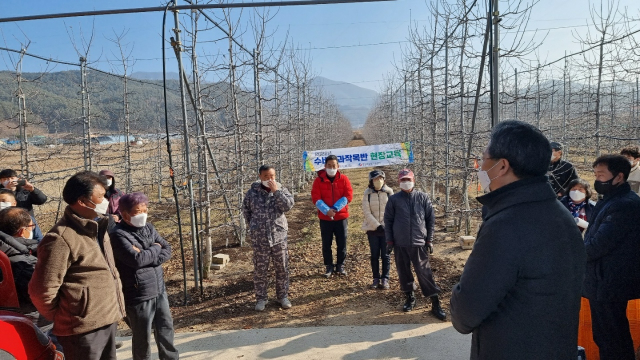이번 현장교육은 코로나19 확산의 어려움 속에서도 마스크 착용, 거리두기 등 예방수칙을 철저히 지키면서 수비사과작목반 회원 중 희망자 및 관심농가 등 40여명이 참석한 가운데 진행되었다.