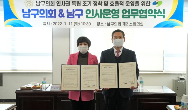이번 협약은 오는 13일부터 시행되는「지방자치법」전부개정에 따라 지방의회 인사권 독립의 성공적인 안착과 효율적인 인사운영 추진이 목적이며, 남구의회와 남구 양 기관은 인사교류, 교육훈련, 후생복지 등 다양한 분야에서 상호 협력할 것을 약속했다.