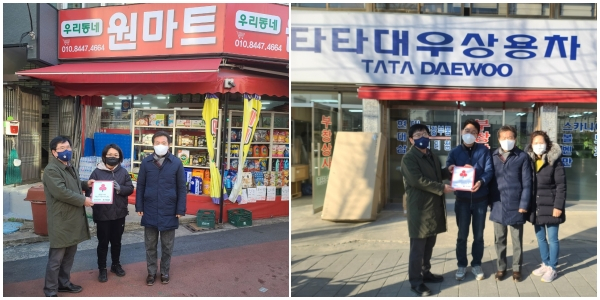 2022년 1월 7일(금) 비산2.3동 지역사회보장협의체(위원장 오중섭)는 가게의 나눔 실천 중 하나인 착!착!착!착! 착한 대구캠페인에 가입한 비산2.3동 착한가게 14호점 우리동네 원마트(대표 김비송) 및 15호점 부창상사(대표 김재목)와 『착한가게』 현판 전달식을 가졌다.