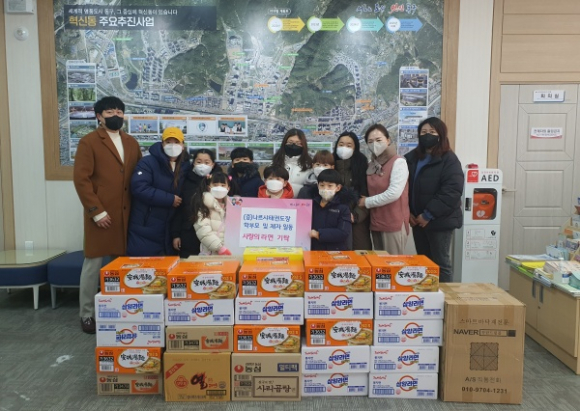 나르샤태권도장 수련생들이 십시일반으로 모은 라면을 포함하여 추가로 학부모들이 마스크 및 핫팩을 혁신동 행정복지센터로 기탁하였으며, 이날 기탁한 물품들은 추운 겨울철 식사해결이 어려운 저소득 취약계층의 독거어르신들에 전달 될 예정이다.