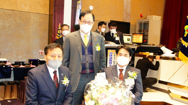 | ↑↑ (좌)윤무곤 취임회장 (중앙)조동희 시도민회 회장 (우)임희태 이임회장 |