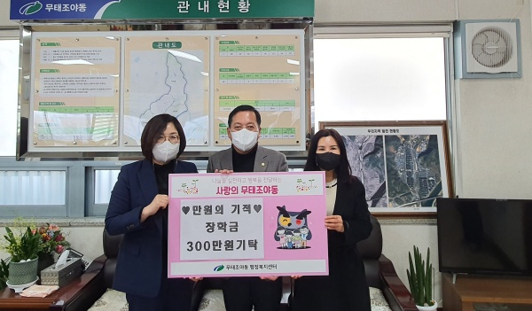 「만원의 기적」(회장 구창교)에서는 관내 저소득 청소년들을 위해 장학금 300만 원을 1월 17일(월) 무태조야동 행정복지센터(동장 오현미)에전달하여 기부문화 확산에 앞장서고 있다.