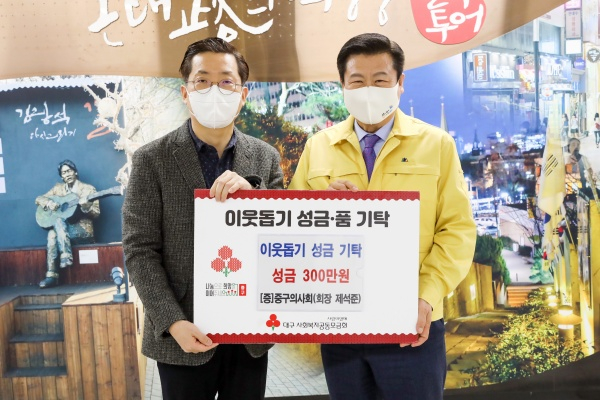 대구광역시 중구 의사회(회장 제석준)는 설을 맞이하여 중구 관내 코로나-19로 어려움을 겪고 있는 이웃을 위해 사용해 달라며 성금 300만 원을 18일 중구청에 기탁했다.