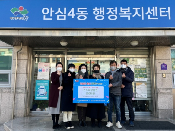 안심4동 경로후원회장 조금옥씨(목련시장 상인회장)는 지난 18일 다가오는 설 명절을 맞아 안심4동 관내 취약계층을 지원하기 위해 온누리상품권 200매(200만 원 상당)를 안심4동에 전달했다.