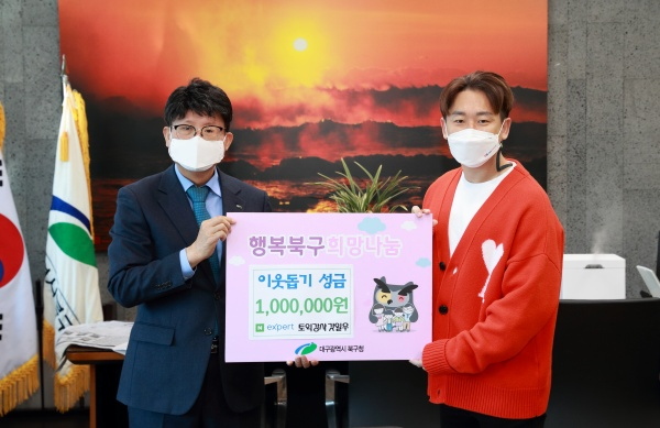 네이버 엑스퍼트 토익강사 갓일우(본명 전일우)는 1월 21일(금) 북구 관내 어려운 이웃들에게 전달해 달라며 성금 100만 원을 대구 북구청에 기탁했다.