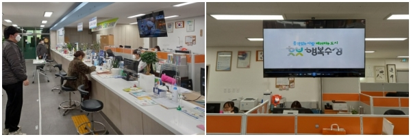 | ↑↑ 지산2동 행정복지센터를 찾은 손님이 민원실 입구에 설치된 홍보용 대형TV를 시청하고 있다(좌), 지산2동 행정복지센터 민원실 입구에 설치된 홍보용 대형TV 모습(우) |