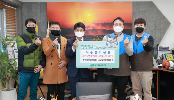 이날 전달식에는 배광식 북구청장과 GS25대구경북영업부문 전승호부문장과 두연협동조합 박준형 국장 등이 참석하였으며, 지역사회 나눔확산에 대한 의견을 나누었다.