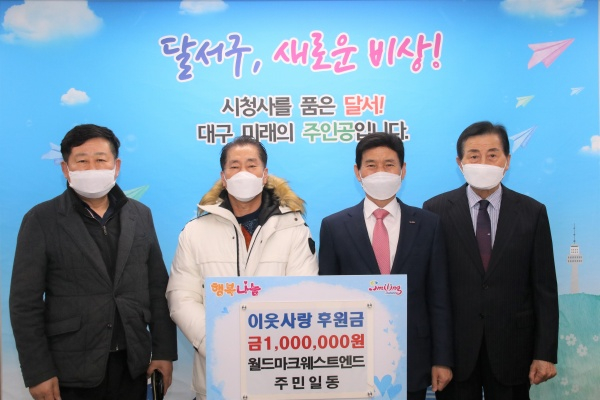 대구 달서구(구청장 이태훈)는 지난 24일 대우월드마크웨스트엔드(감삼동) 주민일동으로부터 관내 어려운 이웃들에게 지원해달라며, 후원금 100만 원을 기탁 받았다고 밝혔다.