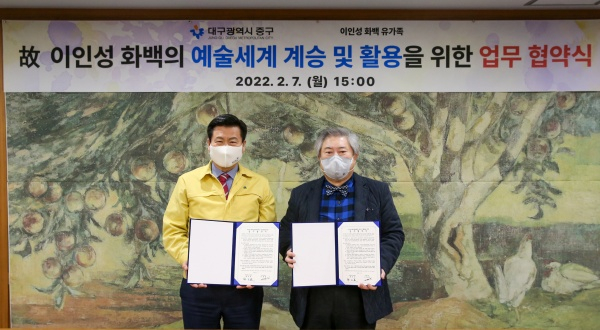대구 중구(구청장 류규하)는 지난 7일 이채원(이인성 유가족 대표)과 이인성 화백의 예술세계 계승 및 활용을 위한 협약식을 맺었다.