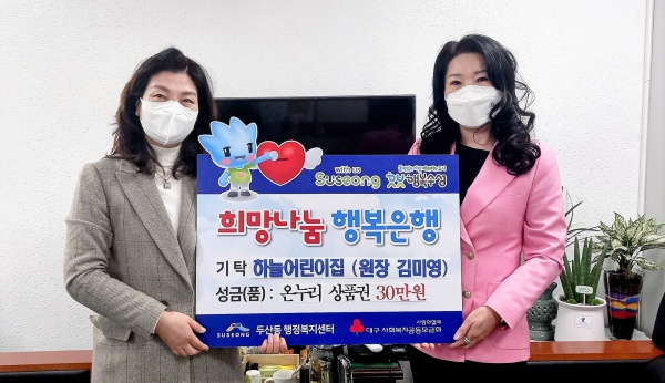 대구 수성구 두산동에 있는 국공립 하늘어린이집(원장 김미영)은 지난 9일 어려운 이웃들에게 전해달라며 온누리 상품권 30만 원을 두산동 행정복지센터에 전달했다.