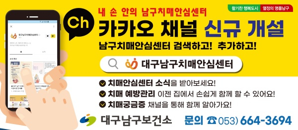 이밖에도 남구 보건소에서는 최근 코로나19 장기화로 바깥 활동에 어려움을 겪는 주민들이 집에서도 손쉽게 남구치매안심센터 소식과 관련 서비스 안내 등 유익한 정보를 받아 볼 수 있도록 카카오톡 채널을 개설하여 좋은 반응을 얻고 있다.(검색 : 대구남구치매안심센터)