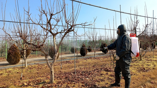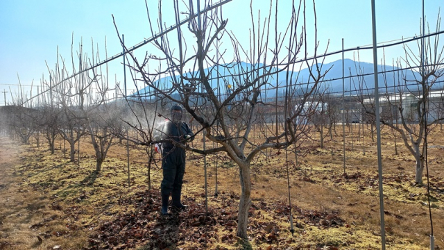동계방제는 과수원에서 발생하는 월동 해충을 겨울철 방제로 병해충의 밀도를 낮추는 아주 중요한 작업이다.