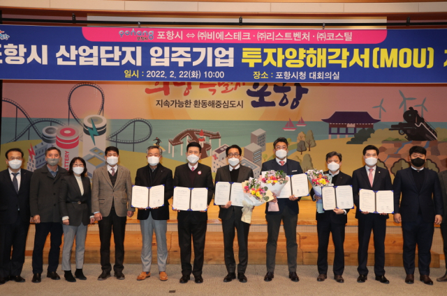 포항시는 22일 시청에서 포항시 주요 산업단지 내 공장 건립 투자를 추진하고 있는 기업 3개사와 투자양해각서(MOU)를 체결했다.