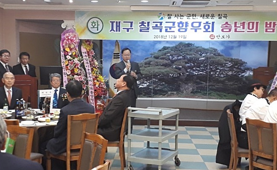 재대구칠곡향우회(회장 박창순)는 지난 19일 저녁 대구 수성구 만보가 연회장에서 ‘잘 사는 군민, 새로운 칠곡’이라는 슬로건 아래 ‘2018년 송년의 밤’ 행사를 개최해 회원들간의 화합을 다졌다.