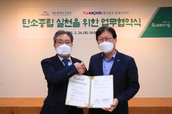 대구 수성구(김대권 구청장)는 24일 오전 10시 수성구청에서 한국전력공사 대구본부 동대구지사와 탄소중립 실천을 위한 업무협약’을 체결했다.