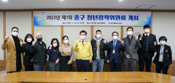 대구 중구청(구청장 류규하)은 지난 23일 구청 상황실에서 중구 청년정책 위원 10명이 참석한 가운데 ‘2022년 제1회 청년정책위원회’를 개최했다.