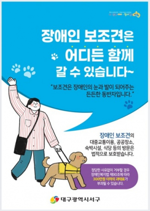 대구 서구청(구청장 류한국)은 서구 장애인보조견 생활이용편의지원조례에 따라 장애인 보조견 환영스티커 및 안내문을 제작하여 배부한다고 밝혔다.
