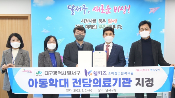 대구 달서구(구청장 이태훈)는 2일 웰키즈소아청소년과의원(원장 장재원외 2명)을 아동학대로 분리보호된 아동에 대한 건강검진과 심리검사 지원을 위해 전담의료기관으로 추가 지정하며, 지정서를 전달했다고 밝혔다.