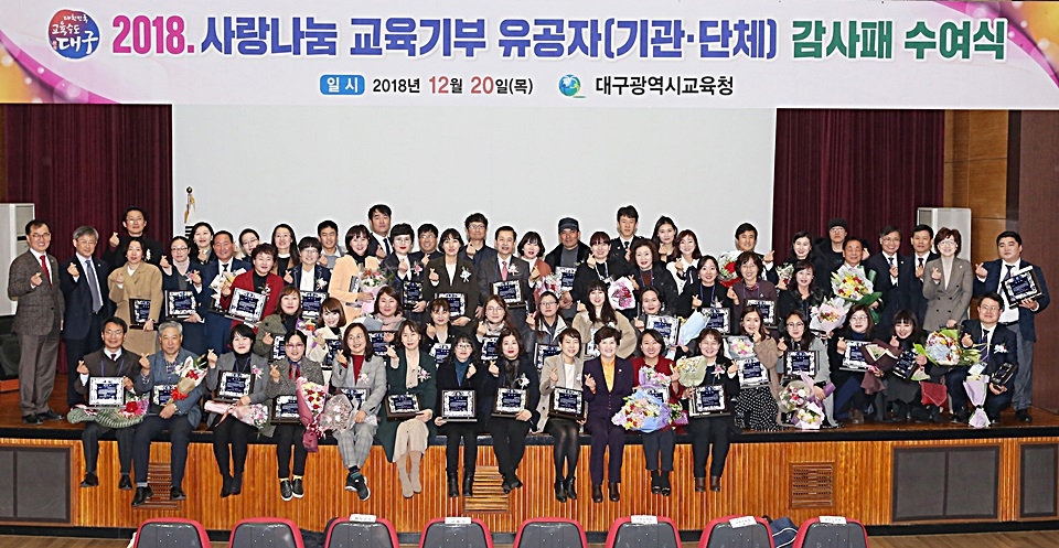 대구시교육청(교육감 강은희)은 지난 20일 시교육청 행복관에서 2018년도 사랑나눔 교육기부 유공자(기관, 단체)를 대상으로 교육기부 감사패 수여식을 가졌다.이번 행사에는 교육기부 문화 확산에 노력한 91명의 유공자(기관, 단체)와 이를 축하하기 위한 관계 학교장, 동행인 등 300여 명이 참석했다.