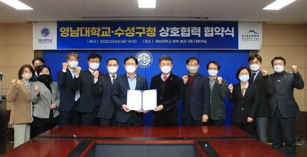 대구 수성구(김대권 구청장)는 지난 4일 영남대학교 대회의실에서 영남대학교와 사회공헌 및 봉사활동 협력을 위한 업무협약을 체결했다. 이날 협약식에는 김대권 수성구청장, 최외출 영남대학교 총장을 비롯한 양 기관 관계자 10여 명이 참석했다.