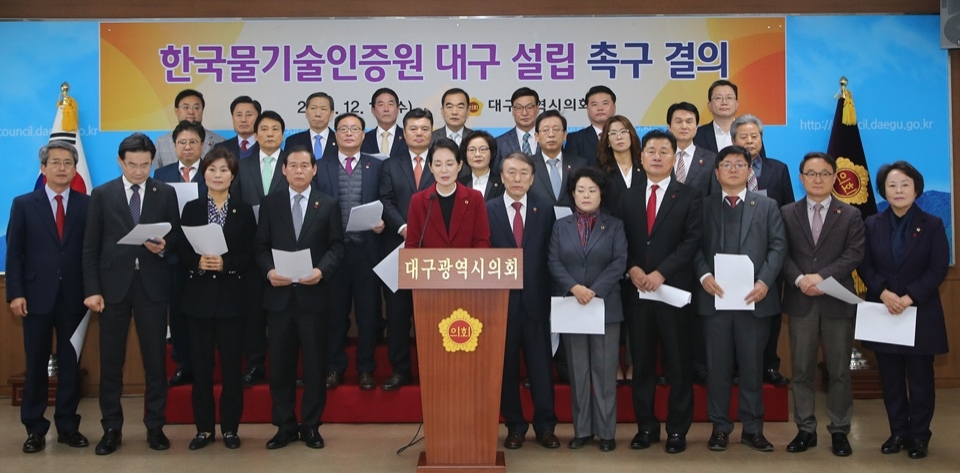 대구광역시의회는 하병문 의원(경제환경위원회 위원장)이 대표발의한 '한국물기술인증원 대구 설립촉구 결의안'이 지난 19일 제4차 본 회의에서 채택되고 한국물기술인증원을 물산업클러스터내에 조속히 설립할 것을 촉구하는 결의대회를 가졌다.