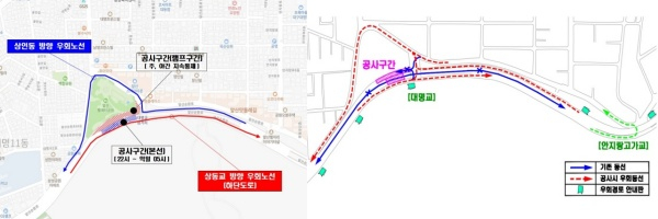 공사기간 중 앞산순환도로(대명교 일원) 본선구간이 야간에는 전면통제됨에 따라 상인동 방향으로는 대명교 진입 전 램프구간에서 진출하여 앞산빨래터공원 북편에서 서편을 경유한 우회로를, 상동교 방향으로는 대명교 진입 전 램프구간(하단도로)으로 연결되는 우회로를 운영하고 주변을 통행하는 운전자가 사전에 공사 구간을 인지할 수 있도록 공사안내표지판과 현수막, 안전사고 예방을 위한 각종 안전시설물을 설치하고 사인카, 신호수 등을 운용할 예정이다.