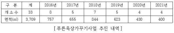 삭막한 건물 옥상 콘크리트 공간을 푸른 도심공간으로 조성하는‘푸른옥상가꾸기 사업’은 2016년도부터 3,709㎡의 건물 옥상을 녹지공간으로 탈바꿈 시켰으며 매년 지속적으로 추진할 계획이다.