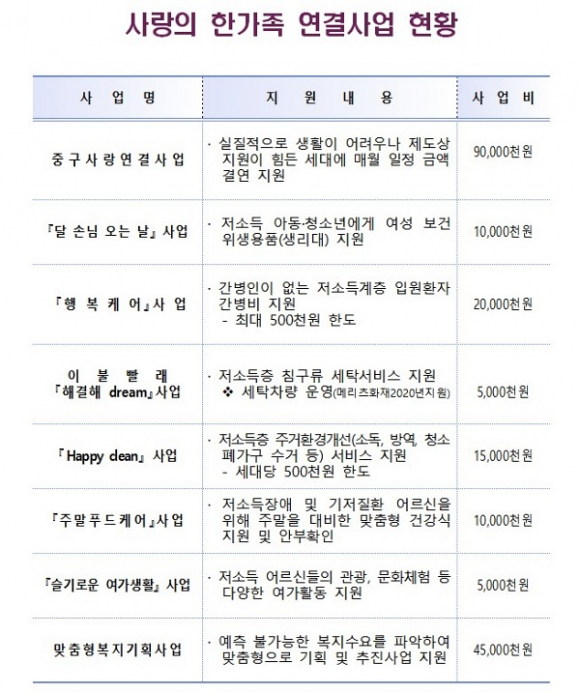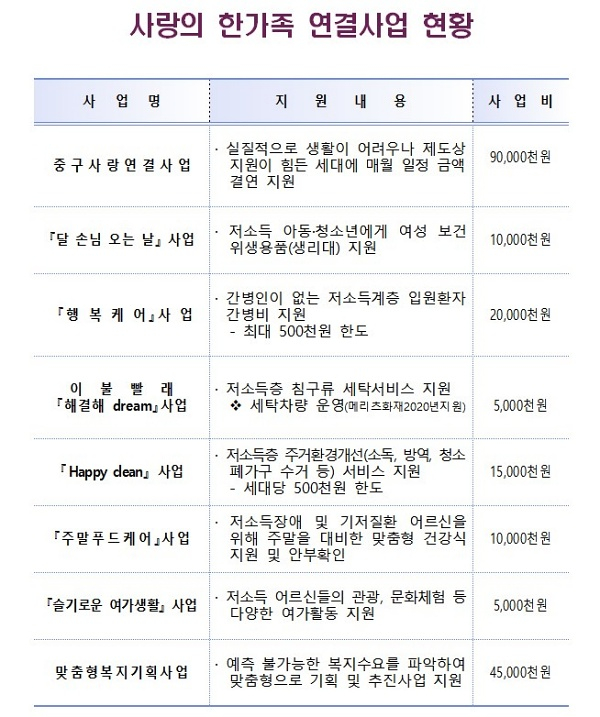 ‘사랑의 한가족 연결사업’은 공공복지 지원의 한계에 따라 실질적으로 어렵게 살아가는 저소득 주민이 있어도 지원을 받을 수 없는 복지사각지대 주민을 지원 대상으로 한다.