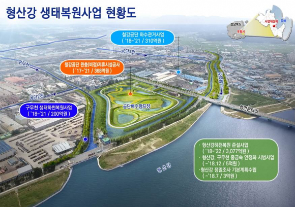 또한, 포항시는 올해 4월 환경부로부터 통합 집중형 오염지류 사업으로 선정된 3개 사업(완충저류시설 설치사업, 철강공단 하수관거 정비사업, 구무천 및 공단천 생태하천복원사업)과 2019년 형산강 본류의 하천복원 시범사업 신규예산 2억(총 사업비 495억)을 확보함에 따라 앞으로 차질 없이 사업이 추진되도록 최선을 다할 방침이다.