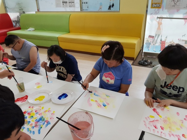 | ↑↑ 범물장애인주간보호센터에서 성인발달장애인들이 의사표현을 위한 미술심리치료 수업에 참여하고 있다. |
