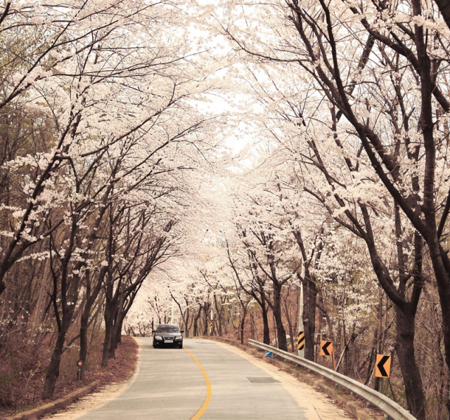 중부내륙 고속도로 위 산 정상을 지나는 9.8km의 벚꽃길로 예상 만개 시기는 4월 15일경이다. 환상의 드라이브 코스를 즐겼다면 보물이 많은 대둔사에도 가기를 추천한다.
