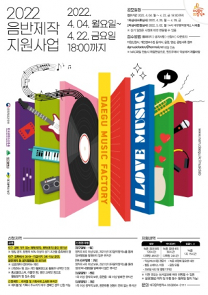대구광역시가 주관하고 남구가 운영하는 대구음악창작소에서는 대구 지역의 새로운 뮤지션을 발굴하고, 음악성 있는 경력 뮤지션들의 역량을 강화하기 위해 「2022 음반제작 지원사업」을 추진한다.