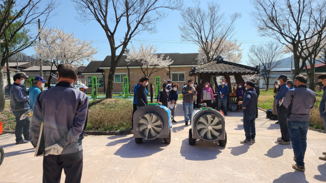상주시농업기술센터(소장 최낙두)는 4월 8일 상주 공성면 문화마을회관 전정에서 작목별 맞춤형 안전관리 실천시범 사업의 일환으로 안전 장비 및 보조구 시연회를 개최했다.